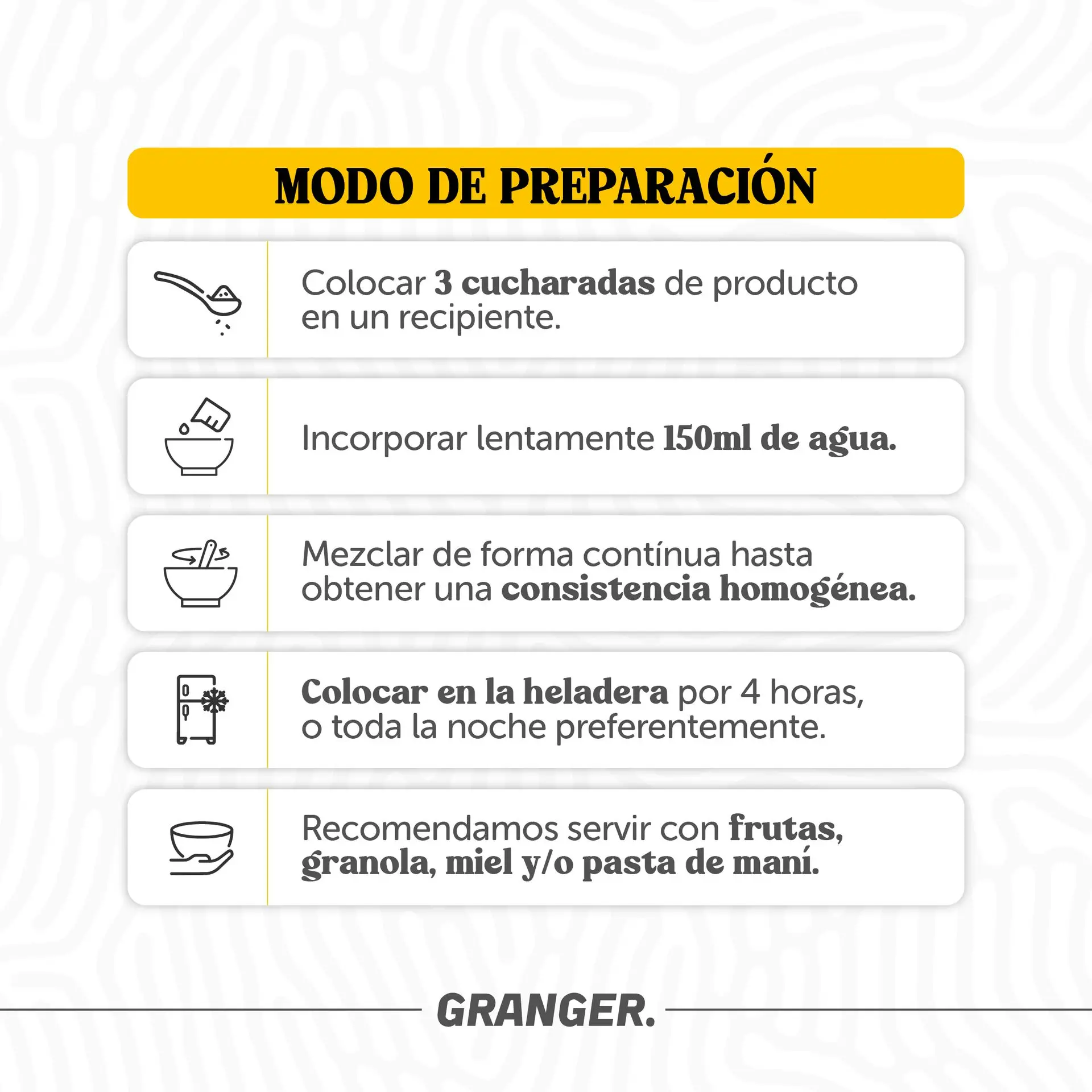 - Añadir dos cucharadas soperas en un vaso o frasco y 120ml de agua, leche o bebida vegetal.