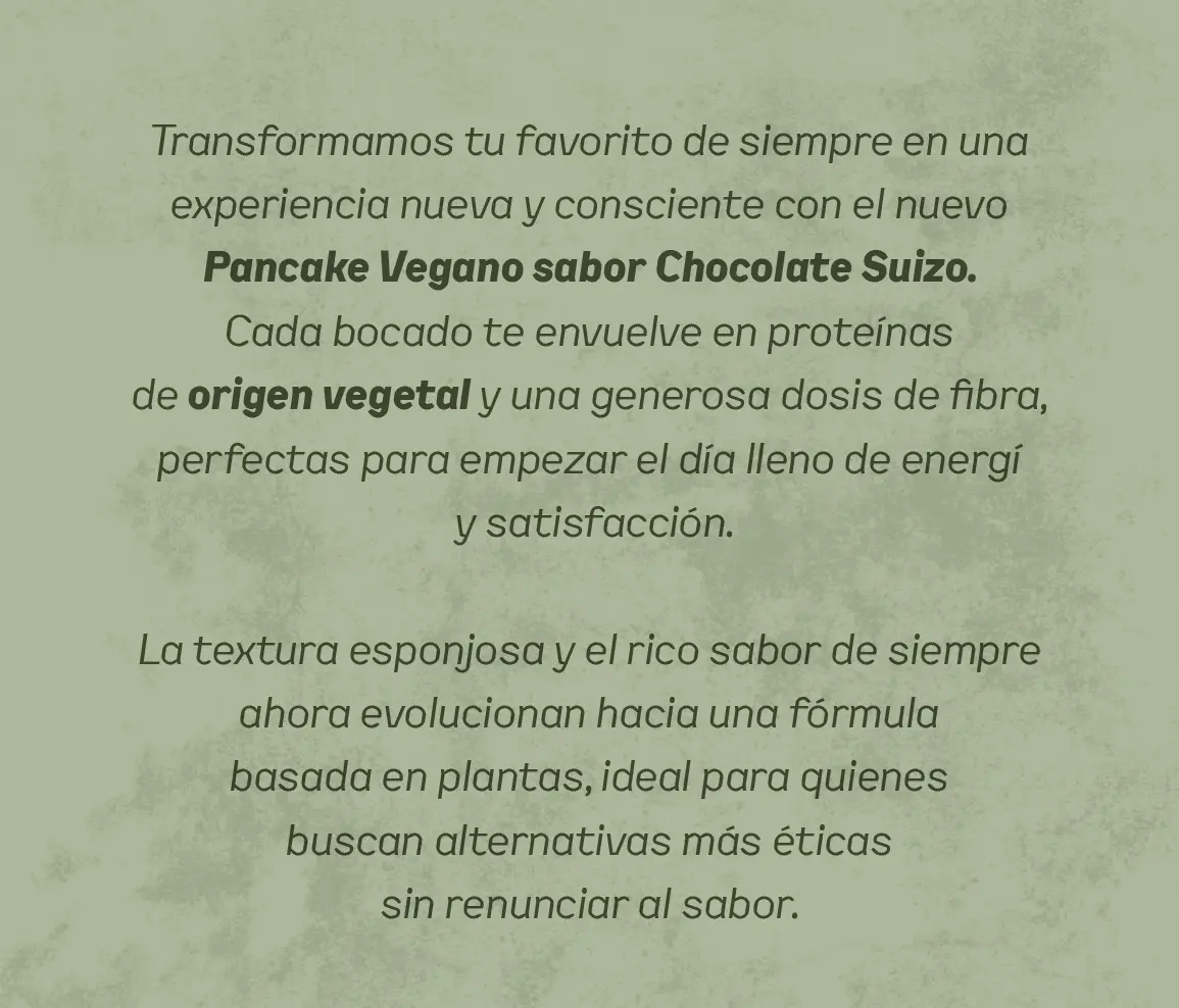 Es un pancake proteico elaborado con fuentes vegetales de proteína y fibra, sin azúcares agregados ni grasas trans. Una opción práctica, deliciosa y 100 % vegetal, pensada para quienes buscan alimentarse de forma saludable, sin ingredientes de origen animal. Ideal para desayunos, meriendas o snacks funcionales que te nutren y te dan energía real.