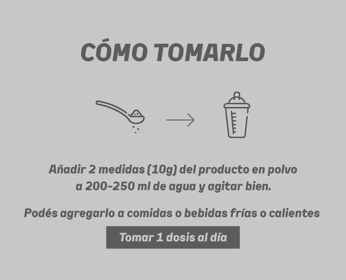Agregar dos medidas (10 g) del producto en polvo a 200 - 250 ml de agua y agitar bien.